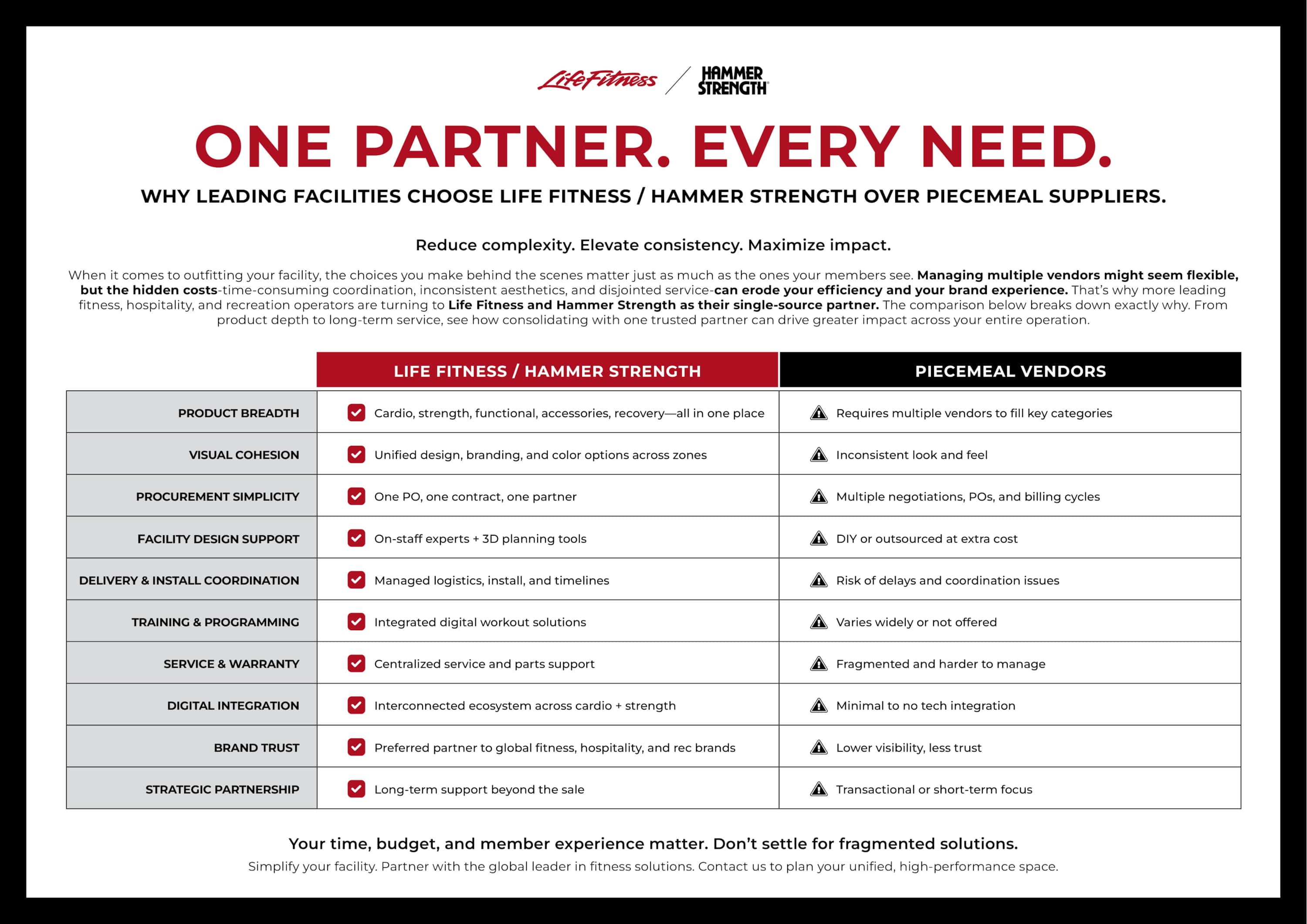 At first glance, managing multiple suppliers might seem flexible. But hidden costs, time-consuming coordination, inconsistent design, and fragmented service can quietly erode your operational efficiency and brand perception. That’s why leading operators turn to Life Fitness / Hammer Strength as their single-source partner.