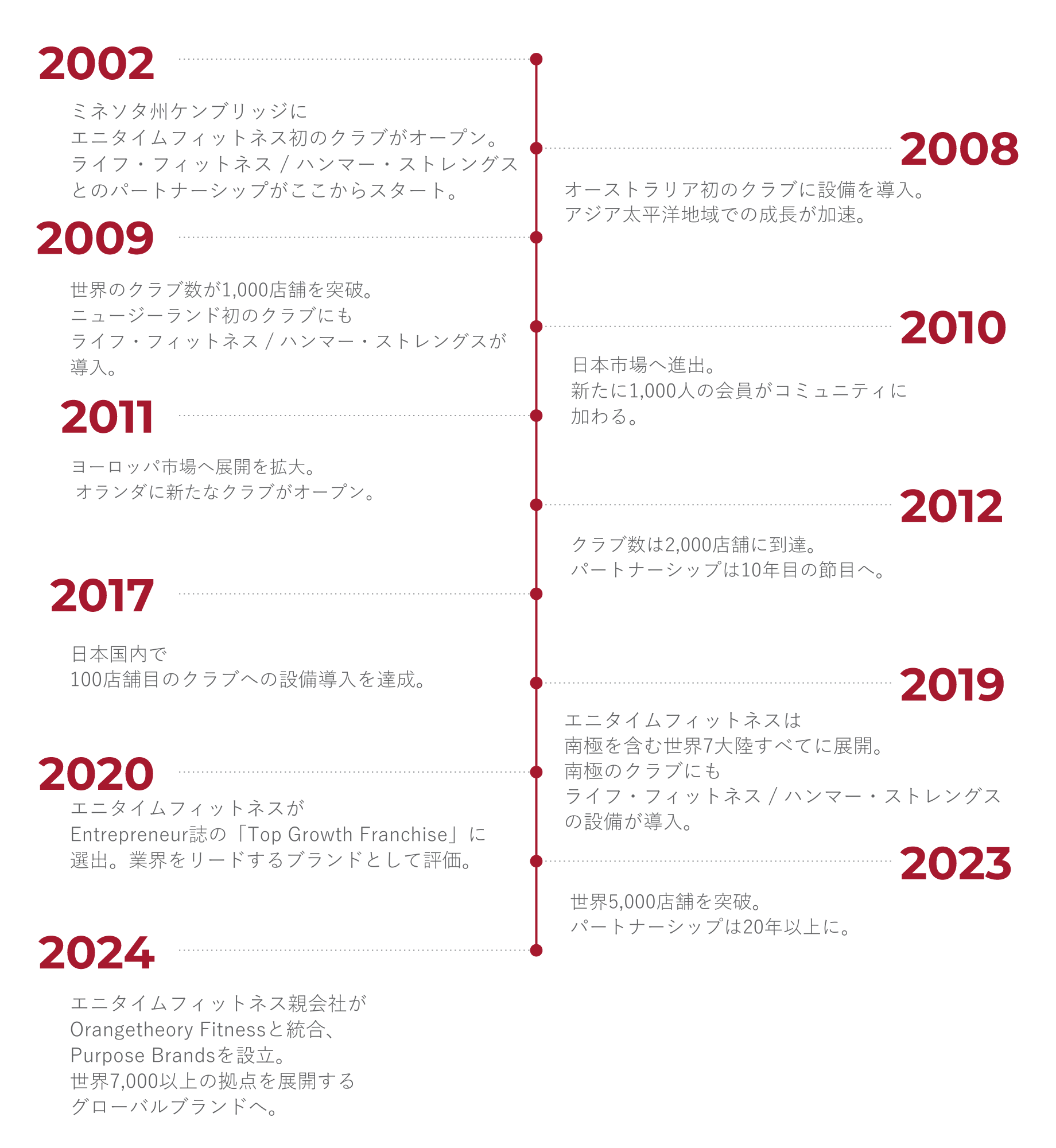 2002年、最初のエニタイムフィットネスクラブの誕生とともに、ライフ・フィットネス / ハンマー・ストレングスとのパートナーシップが始まりました。それ以来、私たちは世界中のクラブとともに歩みながら、トレーニング環境の進化を支え続けています。